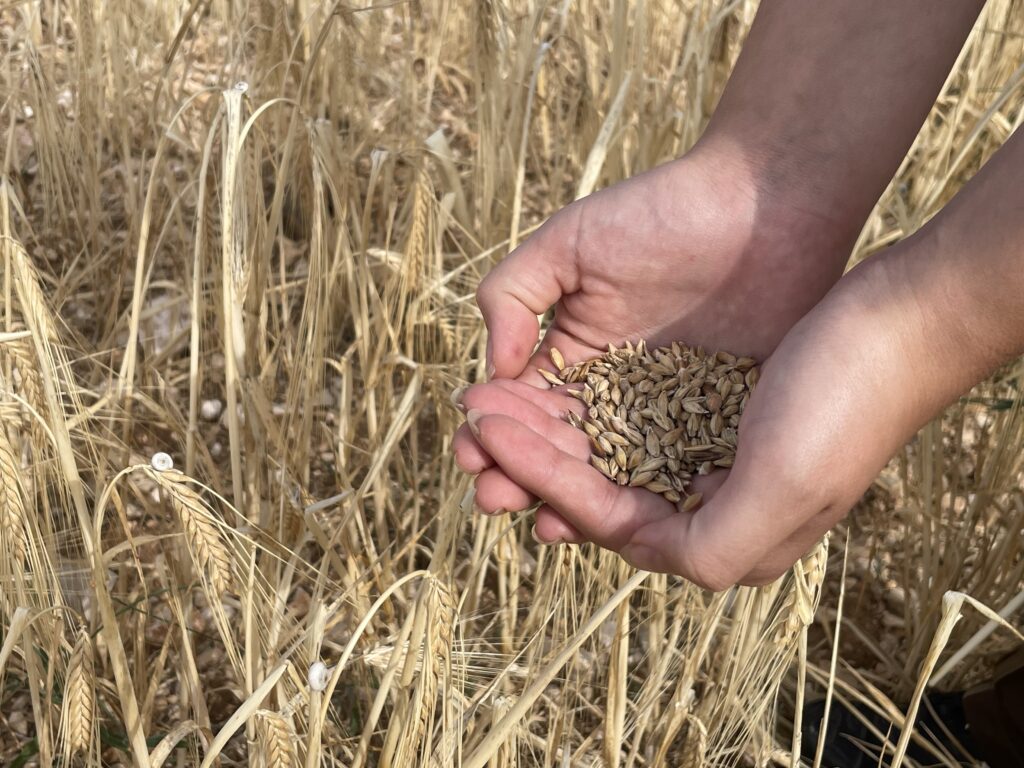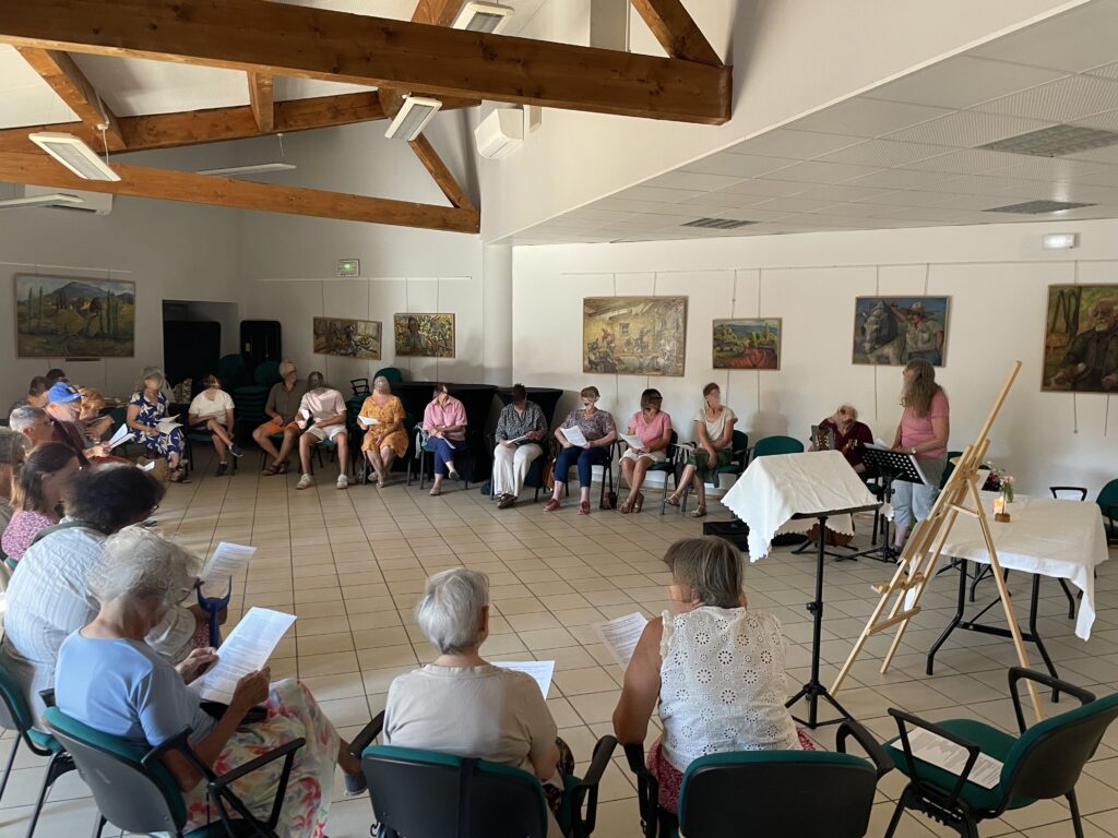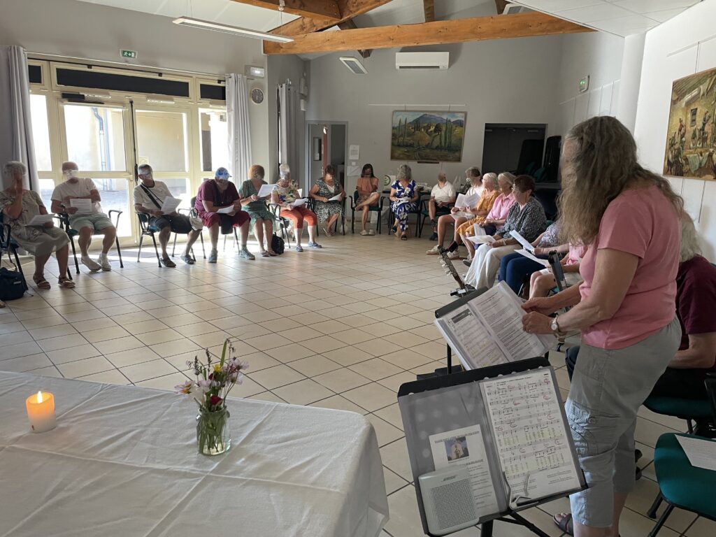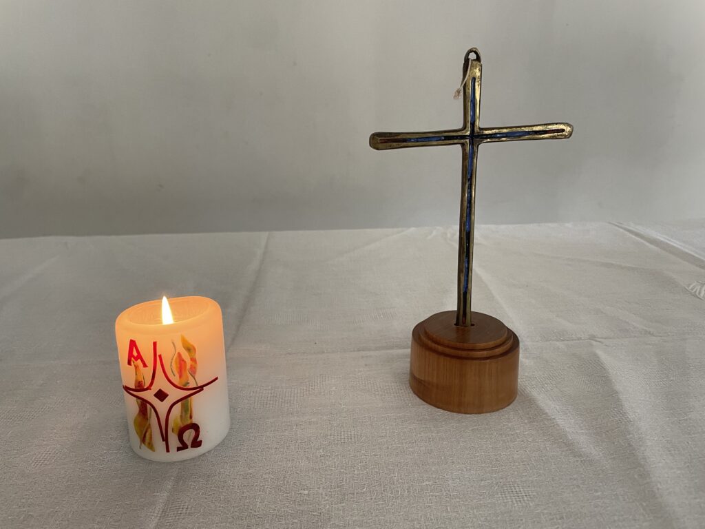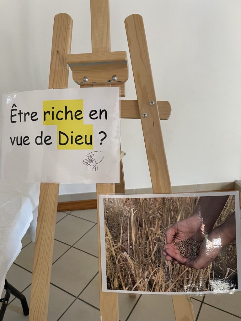 Le visuel choisi pour cette célébration était une photo de mains ouvertes dans un champ de blé, la phrase « être riche en vue de Dieu », une croix, une bougie, et un bouquet de fleurs.