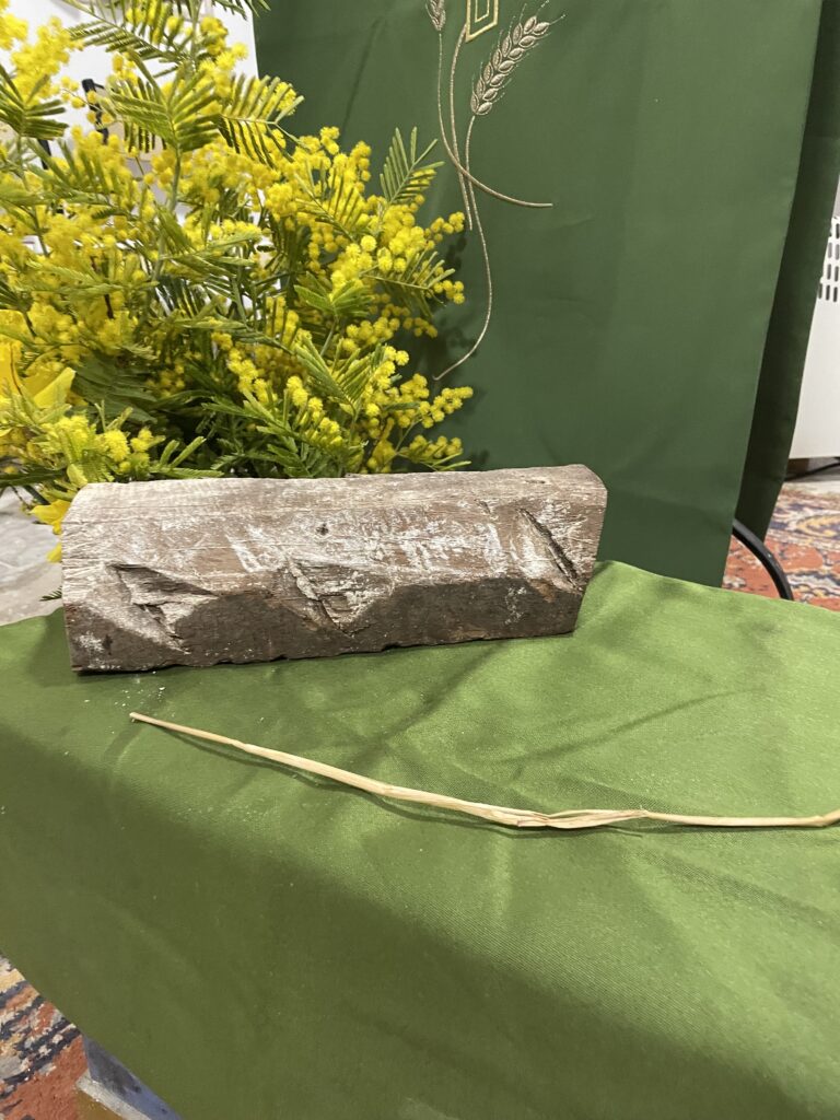 Le visuel choisi pour cette célébration était un simple brin de paille, posé près d’un morceau de poutre sur une petite table devant l’ambon, un cierge, l’arbre évolutif du carême 2024, et un bouquet de mimosa.