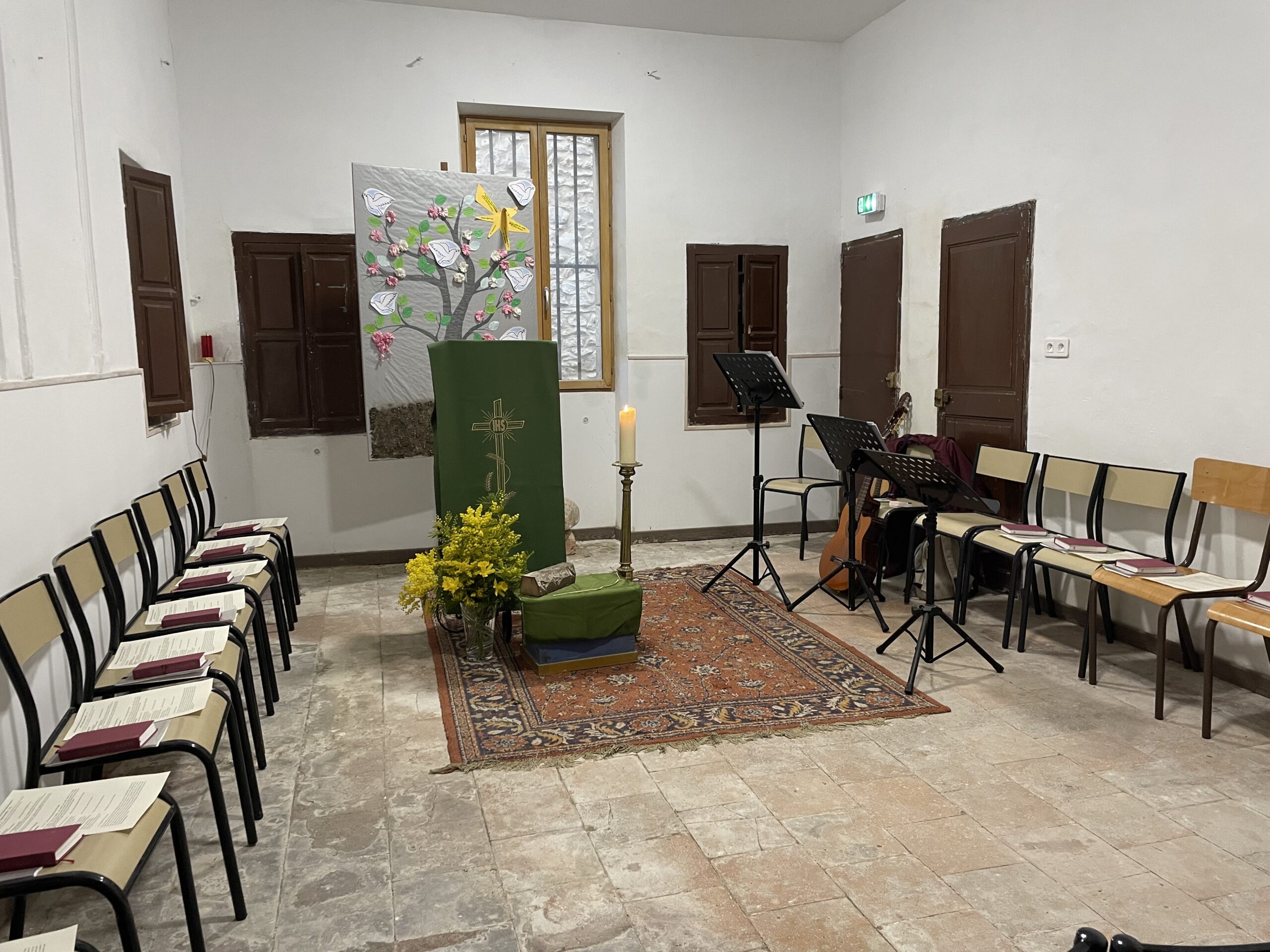 Voici une vue d’ensemble de la petite chapelle préparée pour vivre ce temps de célébration de la Parole: